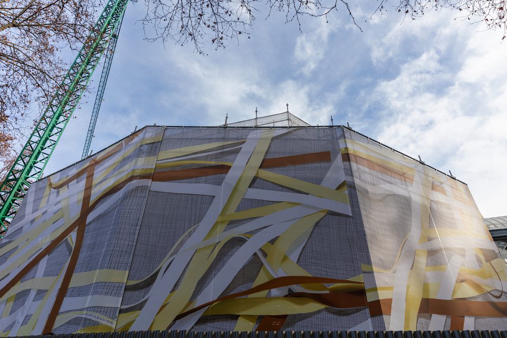 Para realizar el diseño de la lona, Canepa ha creado un mosaico de telas, algunas con motivos que bien pudieran corresponder a las culturas prehispánicas, y otras lisas y de un solo color. Sus distintas partes se han dispuesto alrededor del Palacio de modo que la imagen vaya evolucionando.