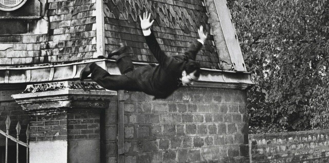 El primer salto al vacío –y probablemente el único– tuvo lugar el 12 de enero de 1960, cuando Klein saltó del segundo piso de la casa en París de la dueña de la Colette Allendy Gallery. Bernadette Allain presenció esta performance privada y confirmó que no hubo nada que amortiguara la caída del artista. Aunque Klein probó su salto con un tobillo torcido, muchos de sus colegas dudaron de la validez de sus afirmaciones, escépticos ante su declarado intento de entrenarse en el ejercicio de la levitación. Una vez realizada la acción, Klein sabía que no iba a poder promover sus ideas sobre la levitación limitándose a hacer una performance para unos pocos, por lo que en octubre decidió volver a repetir la acción únicamente para que se produjera el documento fotográfico. Harry Shunk hizo una serie de fotografías que pegó como collage para crear la impresión de que Klein saltaba sin ayuda desde otra ventana de un segundo piso, a cuatro metros y medio de la calle y sin colchoneta que amortiguara la caída. Se trata de un documento de ficción fotográfica que es claramente producto de una cuidadosa manipulación. La representación final es un fotomontaje que fusiona de forma invisible fotografías independientes del salto y del escenario para juntarlas en un sorprendente ‘documento’ sin líneas de unión.