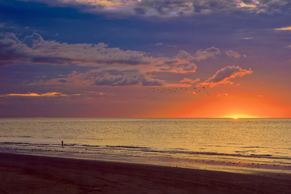 Costa de Gambia. Una figura contempla en silencio el último destello del sol en su crepúsculo cuando un grupo posiblemente de garcetas cruza el cielo hacia Serekunda.