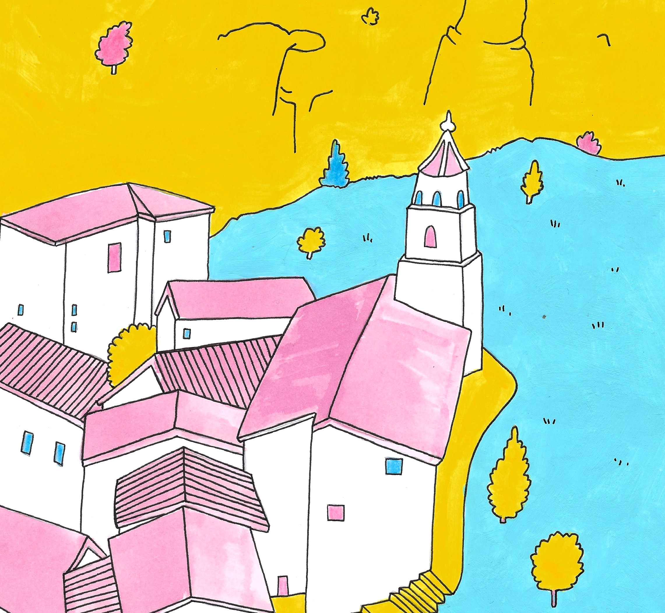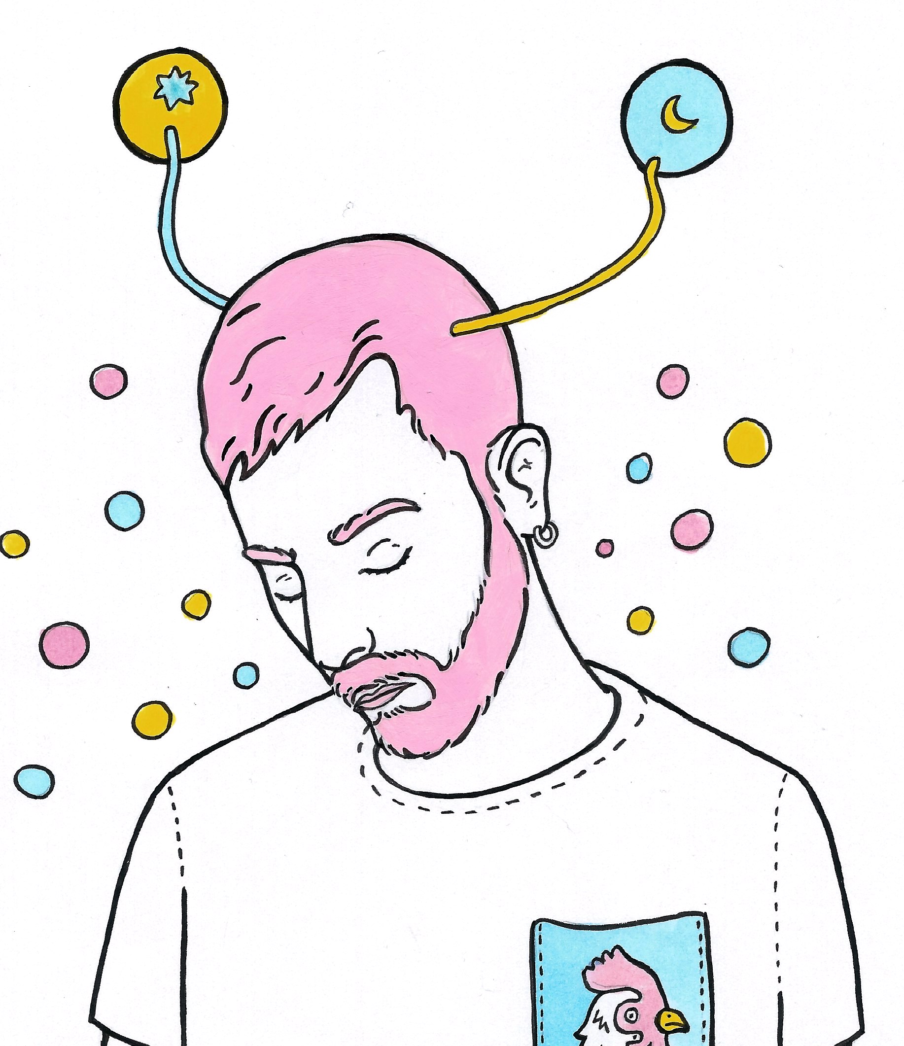 Este viaje está marcado por una de las características más llamativas de su estilo, el uso predominante de tres colores: rosa, azul y amarillo, y un delicado trazo negro muy personal. Como el propio ilustrador explica, “suelen preguntarme por qué pero simplemente es mi forma de trabajar, es lo que me pide el cuerpo cuando me siento frente al papel blanco; y después de tanto tiempo se ha convertido en un modo de pensar”. La lealtad a su paleta le ha permitido crear un lenguaje propio, un mundo psicodélico de colores planos y brillantes.