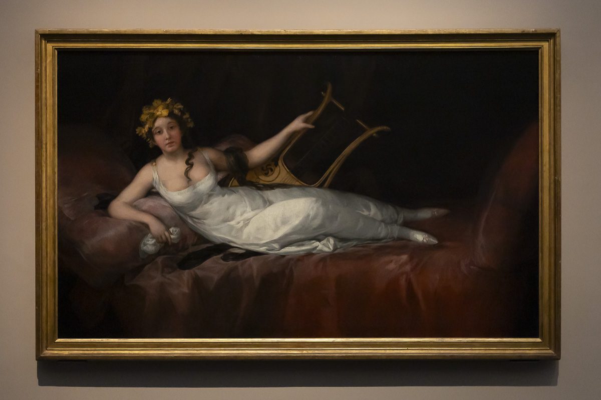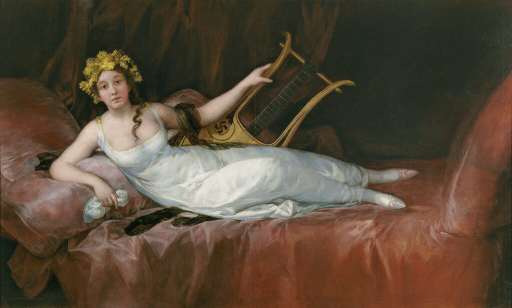 Goya retrató a Joaquina Téllez Girón como una figura refinada, recostada con una lira que alude tanto a la música como al ideal ilustrado. La serena imagen de la marquesa encierra sin embargo un recorrido turbulento que la aleja de la quietud del museo y la sitúa en el centro de conflictos políticos y legales.