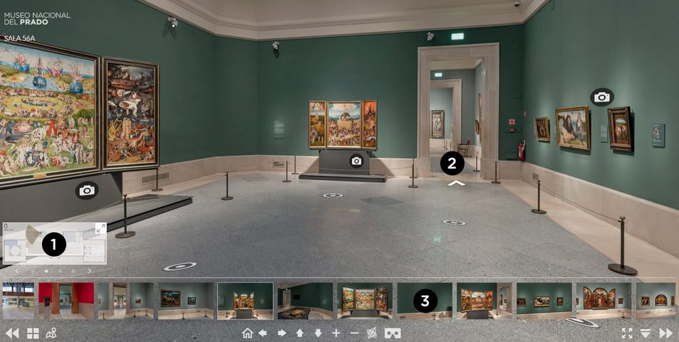 Un recorrido por las plantas baja, primera y segunda a través de las panorámicas 360⁰ permite apreciar las obras y su disposición en las salas, ofreciendo una selección de obras digitalizadas en gigapixel, incluyendo cinco esculturas en 3D-Photo. A partir de esta digitalización se han creado 10 recorridos temáticos que, a través de una selección de obras, explican mediante una introducción locutada los detalles que luego se pueden descubrir accediendo a cada una de ellas.