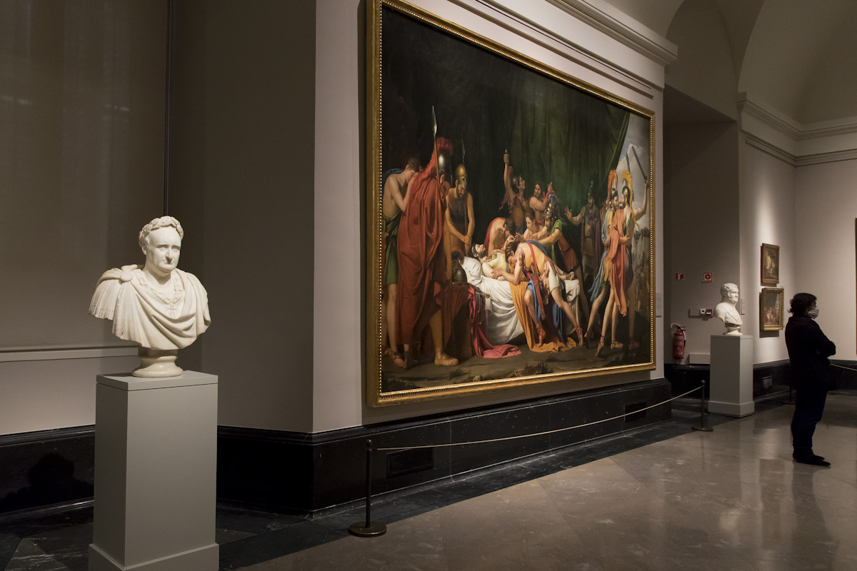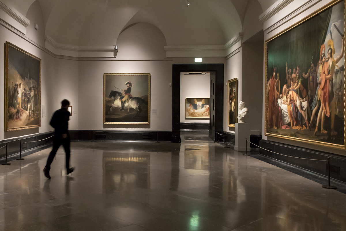 Tras un recorrido por las pinturas murales al óleo que ocuparon dos habitaciones de la llamada Quinta del Sordo, que Goya había comprado en 1819, las Pinturas negras, y por otras obras de sus años finales, el visitante se adentra en la sala 64 con obras realizadas durante las dos primeras décadas del siglo XIX, una época marcada en España por la crisis derivada de la expansión napoleónica, que enfrenta el 2 y 3 de mayo de Goya a La muerte de Viriato, jefe de los lusitanos de José de Madrazo, junto a su boceto, obra marcada por el canon neoclasicista.