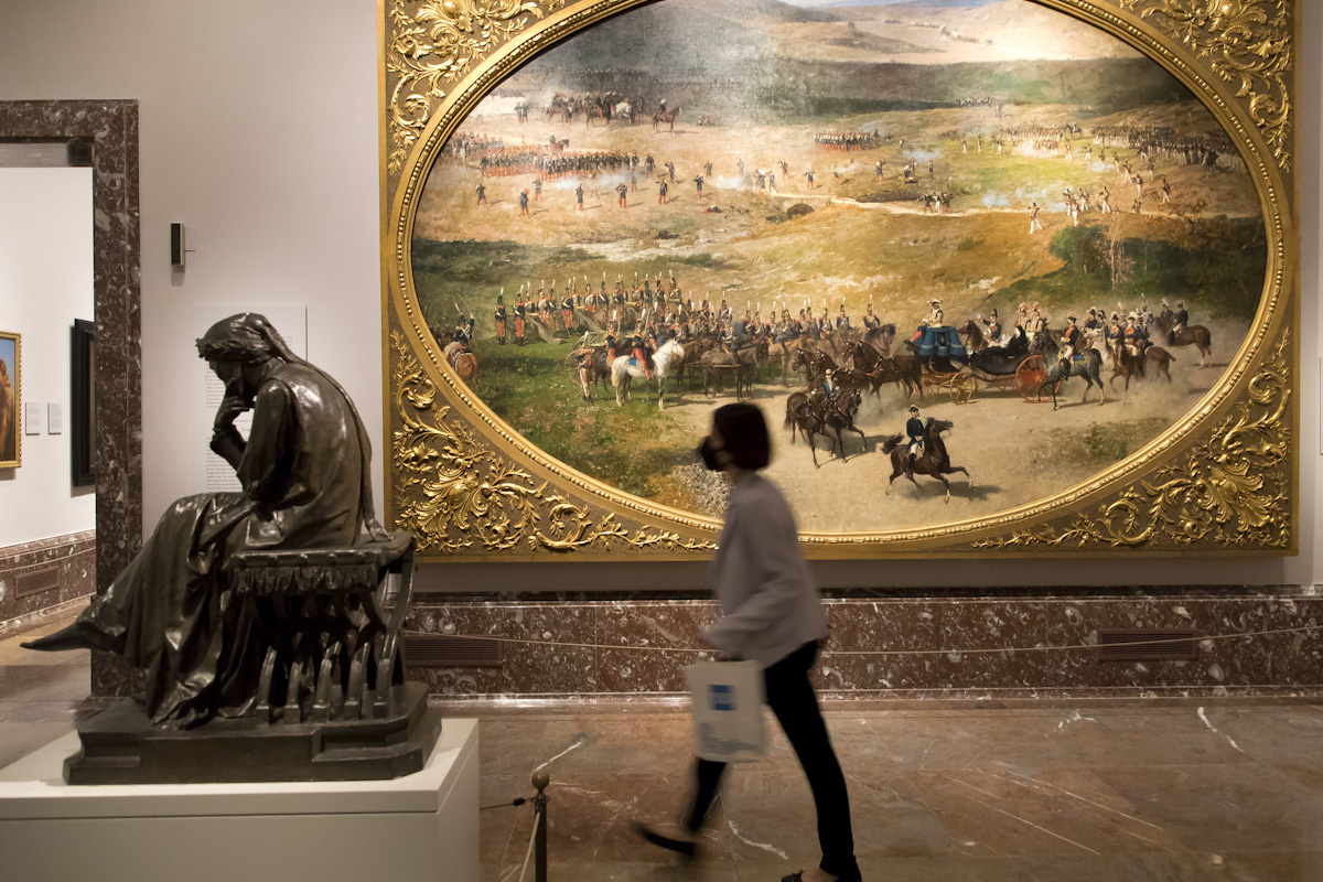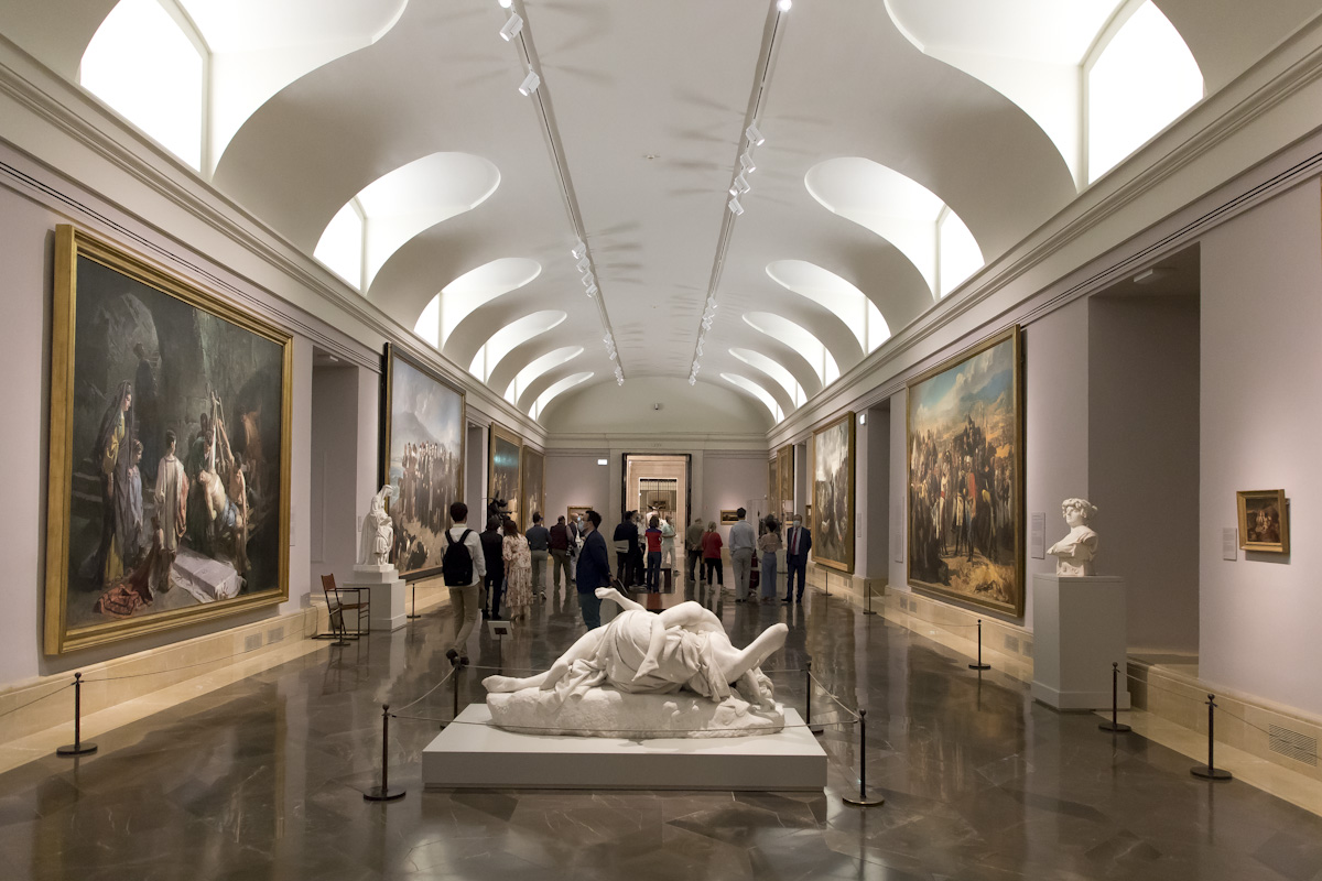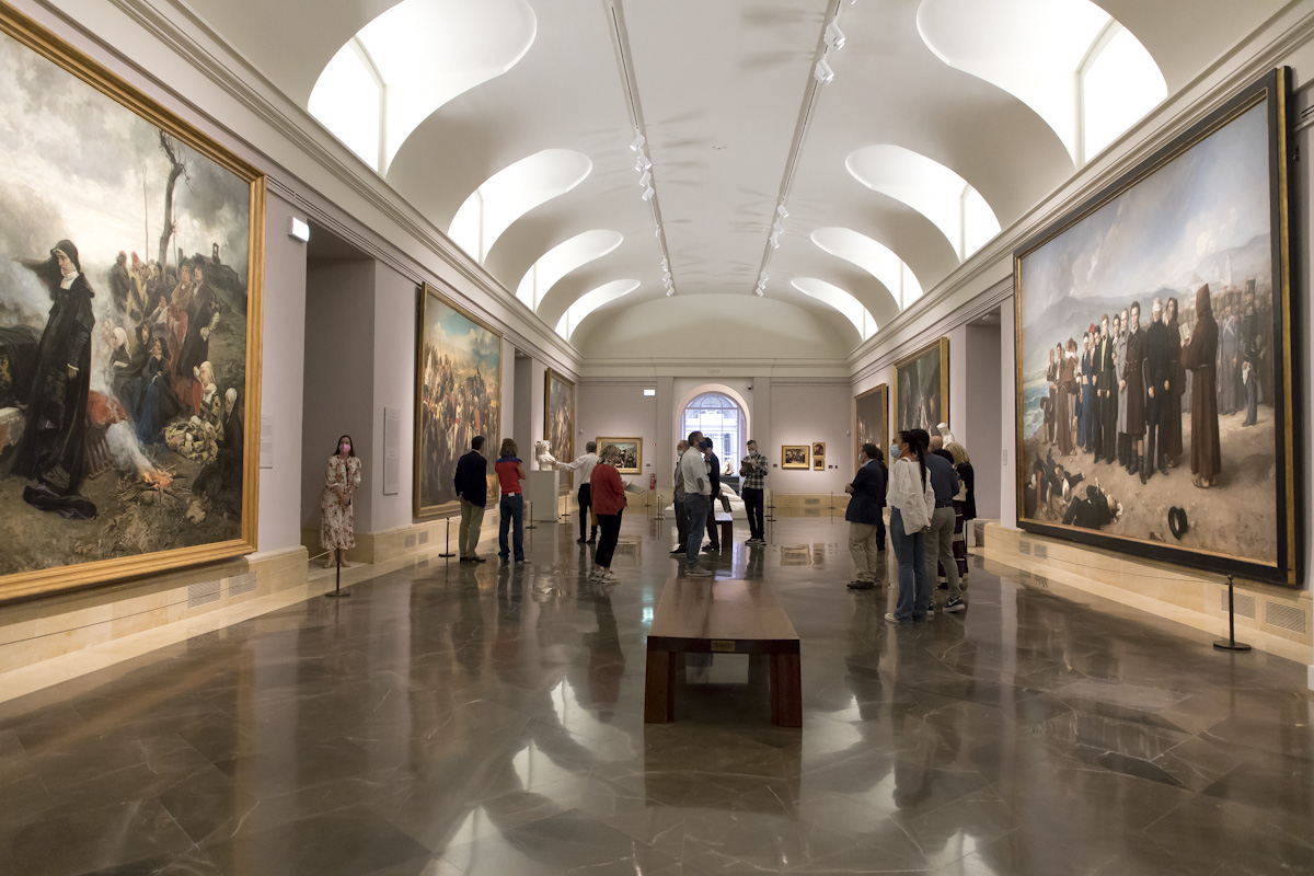 El paso hacia la sala 75, gran galería abovedada, sumerge al visitante en un conjunto de acontecimientos y personajes históricos al servicio de los valores nacionales entonces emergentes a través de obras de gran formato que, en ocasiones, pueden contemplarse junto a su boceto. Aquí se puede contemplar la evolución estilística, igual que en la escultura, desde el purismo académico inicial al realismo y al naturalismo. Una obra en material no habitual, la cera policromada, el modelo del sepulcro de Colón en la Catedral de Sevilla, realizado por Arturo Mélida, amplia la visión finisecular.