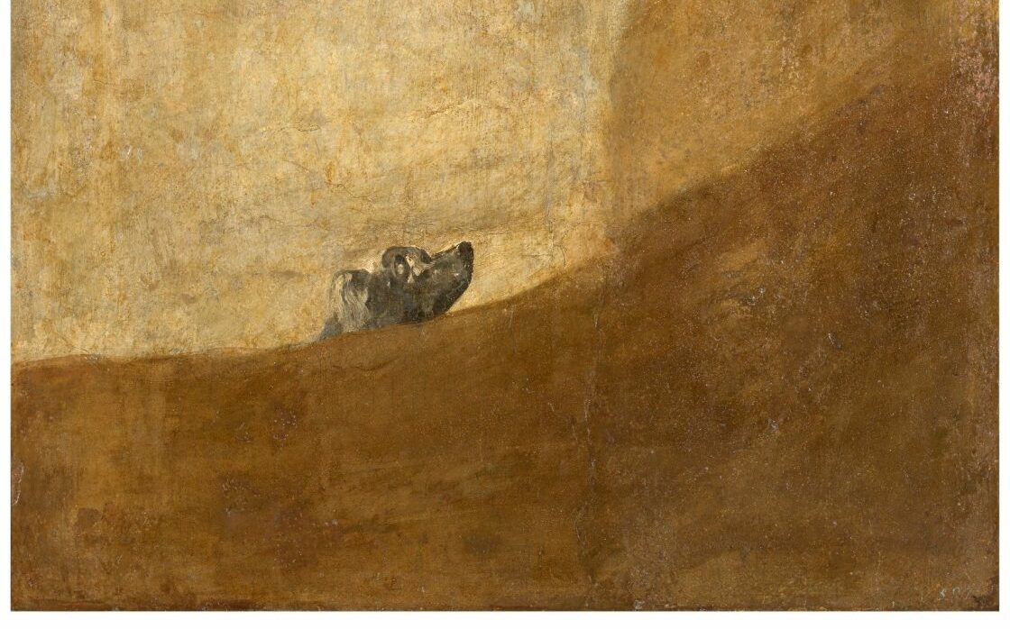 Detalle de "Perro semihundido" (1820 – 1823. Técnica mixta sobre revestimiento mural trasladado a lienzo, 131,5 x 79,2 cm, Sala 067 del Museo del Prado).
