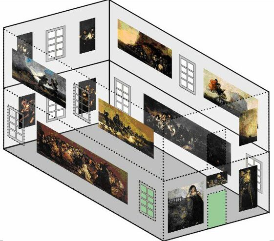 Concretamente, las obras se distribuyen entre los dos pisos de la quinta, que tenían forma rectangular, ocupando todas las paredes. En el primer piso, encima justo de la puerta, una de las obras de menor tamaño: Dos viejos comiendo sopa; al lado derecho de la puerta: Dos viejos; y a la izquierda: Una manola: Doña Leocadia Zorrilla. En los muros largos de la habitación se mostraban otras dos pinturas de amplio formato apaisado: en el lado izquierdo, El aquelarre, y enfrente, La romería de San Isidro. En la pared opuesta, a la derecha de la ventana: Judith y Holofernes; y al otro lado, una de las más conocidas y esperpénticas, su peculiar versión de Saturno devorando a un hijo.