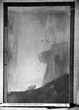 Concretamente, la obra que nos ocupa es una de las más enigmáticas y, en nuestra opinión, una de las más sugestivas. Perro semihundido (1820 – 1823. Técnica mixta sobre revestimiento mural trasladado a lienzo, 131,5 x 79,2 cm, Sala 067 del Museo del Prado) se hallaba en el primer piso de la Quinta del Sordo y se resume en dos enormes superficies cromáticas ocres de las que sobresale, a duras penas, un punto de figuración: la cabeza del perro.