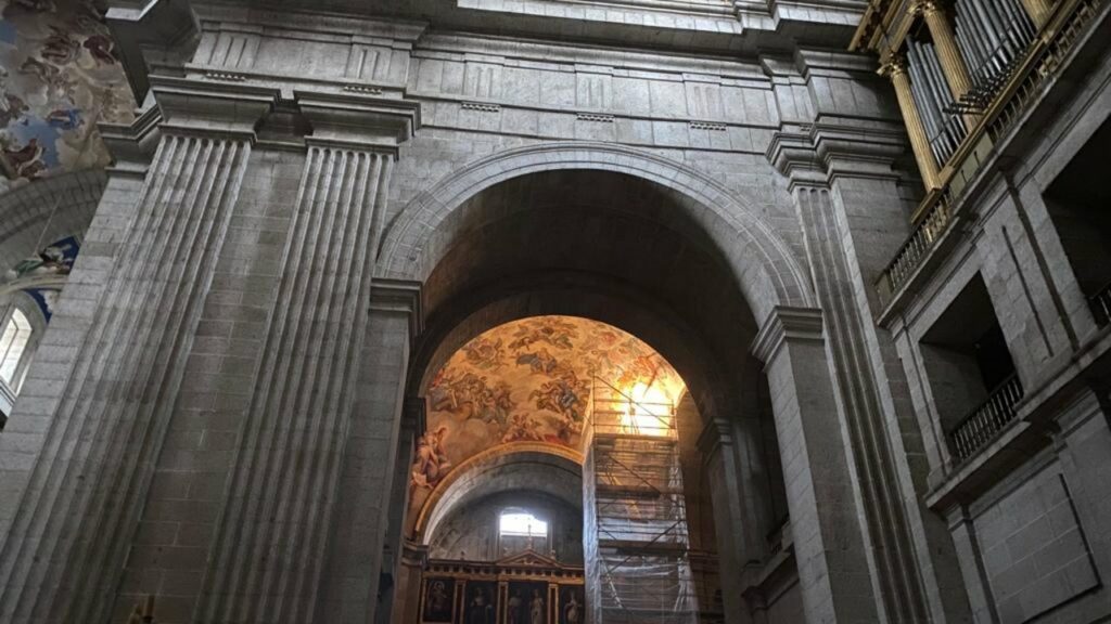 Patrimonio Nacional también ha restaurado tres de los ‘cielos’ con los que Giordano decoró hace más de 300 años las bóvedas de la Basílica de El Escorial. Con la ayuda de varias torres de hasta 20 metros de altura se ha podido actuar sobre tres pinturas murales con escenas religiosas: El juicio de San Jerónimo, El misterio de La Encarnación e Historias del rey David. El maestro napolitano las realizó por orden de Carlos II entre 1693 y 1695.