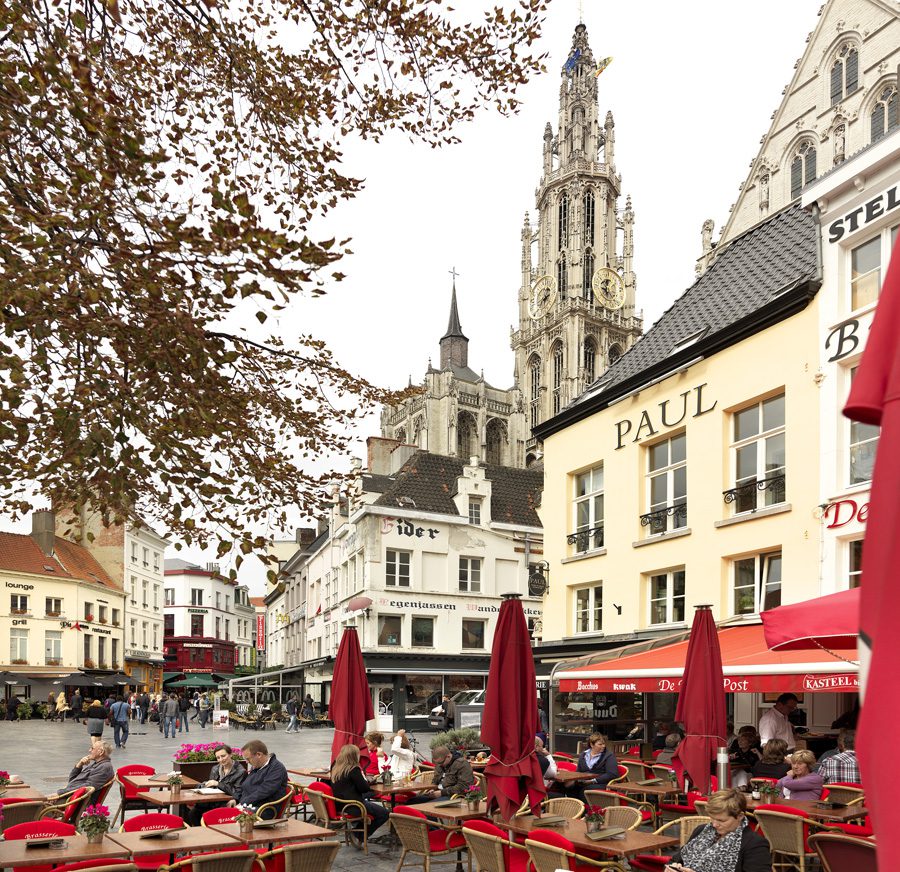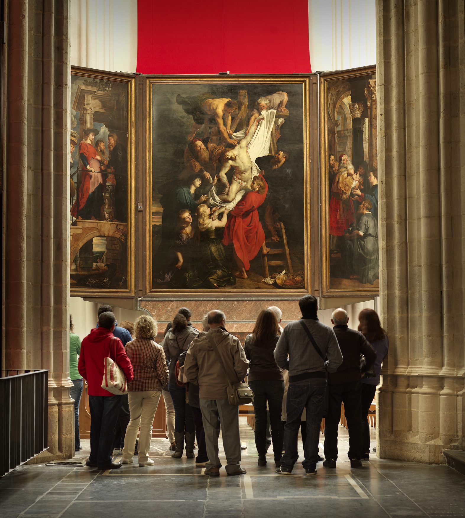 En el centro de la Groenplaats se yergue un monumento dedicado al maestro, tras el que sobresale la torre gótica más alta del país: el campanario de la Catedral de Nuestra Señora [2], que alberga cuatro magníficas obras de Rubens: La Asunción de la Virgen, El descendimiento de la cruz y los trípticos La elevación de la cruz y la Resurrección de Cristo.
