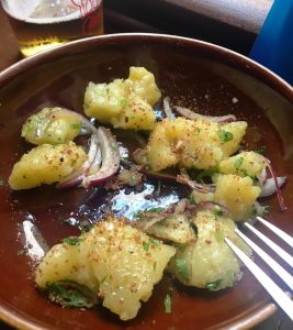 Intentando recomponernos del disgusto, nos encaminamos hacia la Alameda Apodaca, cruzando todo el centro por el Teatro Falla y la plaza de San Antonio. En el camino, nos topamos con una de las interesantes sorpresas de este viaje, el encantador Recreo Chico, que es en realidad un clásico que estuvo cerrado más de 20 años y recientemente ha reabierto a manos de un equipo joven, alegre y servicial. Disfrutamos con sus sabrosas papas aliñás con huevas de maruca y su guiso del día, una merluza con alubias. Habrá que volver pronto por allí porque, aunque el pescado nos resultó un poco insípido (mala elección por nuestra parte), nos quedamos con muchas ganas de explorar su carta y su cocina con más detenimiento.