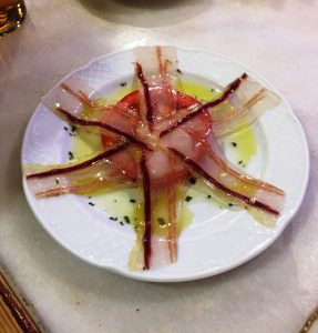 Pero no hay lugar para la añoranza. Otro clásico nos esperaba. Intentamos entrar en un local del que guardamos un gran recuerdo, La Candela, pero fue imposible. Estaba a rebosar. Así que nos encaminamos a Casa Lazo, una referencia en el centro que nosotros aún no conocíamos. Y la verdad, fue un acierto. El local estaba muy ambientado y, tras hacernos un hueco en la barra, disfrutamos de un magnífico tataki de tarantelo de atún. Quizás le sobraba un poco de salsa de soja, pero el pescado era una delicia.