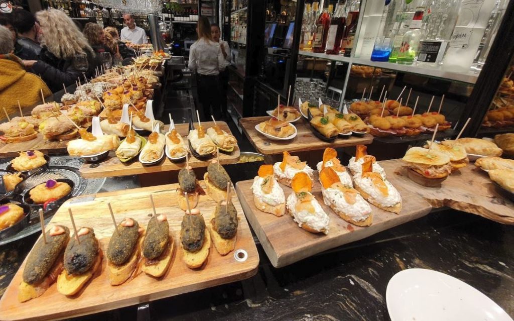 De vuelta al salado, el lugar adecuado para seguir de pinchos en el Casco Viejo es la Plaza Nueva, valga la contradicción terminológica. En sus soportales hay mucha oferta, pero mis barras de pinchos favoritas son Gozatu, Café Bar Bilbao, La Olla (tremendo su pincho de chuletón) o, especialmente, Víctor Montes, una barra para perder la cabeza, o Gure Toki, un local diminuto con una propuesta creativa e imaginativa maravillosa (y uno de los mejores foie a la plancha que recuerdo haber comido).
