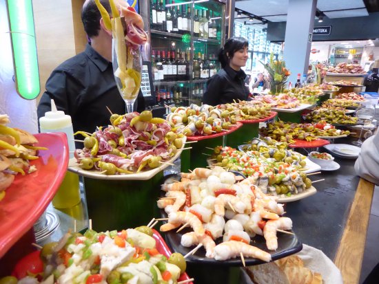 Pero vayamos por partes y empecemos a dar nombres y referencias concretas. Un recorrido feliz por el Bilbao de pinchos y zuritos bien podría arrancar en el Mercado de la Ribera, un ejemplo de reconversión de una plaza de abastos tradicional. Aún conserva estupendos puestos de carnes, pescados, mariscos y verduras en su planta baja, pero ha convertido la alta en un parque temático del aperitivo, especialmente de la Gilda, con varias tiendas especializados en este sabroso encurtido. En sus barras, además, se puede optar entre desayunar (un café y un buen y jugoso pincho de tortilla, por ejemplo) o tomar el primer vermú, vino o caña de la ruta.