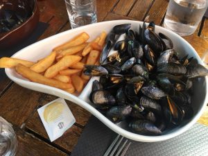 Aunque las galettes y crepes fueron la base de nuestra alimentación, o quizás gracias a ello y al efecto de sus precios asequibles sobre nuestras carteras, pudimos atrevernos algún día a romper el modelo habitual y aventurarnos en otras especialidades de la comida francesa. Así ocurrió en Gastón, en pleno centro de Nantes, un magnífico local junto al Castillo de los Duques de Bretaña que ofrece comida correcta nada más y un poco pesada para nuestro gusto. O en Josellin, la preciosa villa medieval bretona en la que disfrutamos de las ostras y los mejillones con patatas fritas de Le Bistrot, una preciosa terraza en el centro del pueblo, a mitad de camino entre su iglesia gótica y su epatante chateau (castillo) de cuento de hadas.