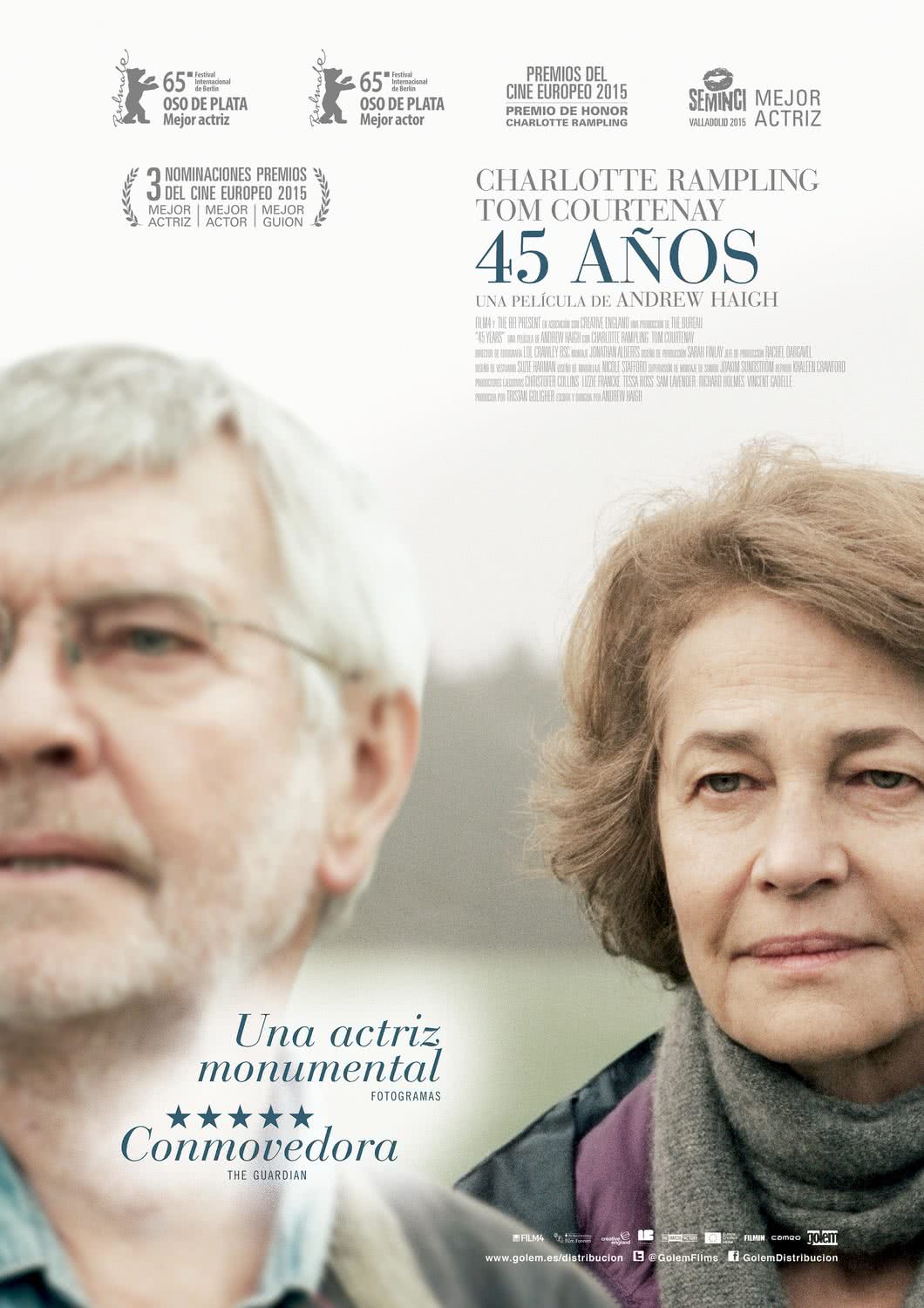 ¿Hay o no hay razones para este súbito cambio en el escenario interior de sus existencias? Filmada en largas secuencias, planos que acaban por inquietar, pues su epílogo, el de cada una de las escenas, no acaba de aclararse hasta el último fotograma, 45 años tiene en la mirada profunda de Charlotte Rampling uno de sus grandes aciertos. Tom Courtenay, que sigue en la vejez conservando las trazas de buen actor habituales en su carrera, le da un meritorio contrapunto. Por algo ambos se llevaron en Berlín los respectivos Osos de Plata a mejor actriz y actor.
