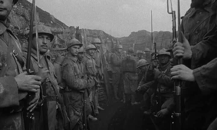 Mucho de lo que Kipling vio y escribió entonces puede ilustrarse con unas cuantas películas que suelen tener como denominador común un manifiesto espíritu antibélico. De la mano del escritor visitamos trincheras, cuevas y refugios, “montones incalculables de suelo levantado que ha quedado a la luz en carne viva”. Esa guerra de las trincheras, que con mano maestra ha dibujado de forma tan obsesiva el francés Jacques Tardi en sus novelas gráficas, la plasmó también como nadie Stanley Kubrick en los minutos iniciales de Senderos de gloria (1957). Película con un mensaje en las antípodas del de Kipling, contiene un paseo –en impecable formato trávelin– por lo que el escritor definió como “la muralla que el Hombre ha construido para defenderse de la Bestia”. El mando francés pasa revista y pregunta a sus hombres: «¿Qué tal, soldado? ¿Dispuesto a matar alemanes?».