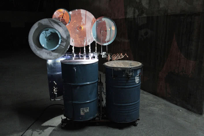 “Para ello hemos creado un máquina, un tríptico mecánico, con la intención de que fuera más pequeña de lo que llevábamos haciendo, que fuera fácilmente transportable y que tuviera un montaje rápido y fácil para poder volver al escenario, ya que sólo tienes 20 minutos para montar, probar y esas cosas”, apunta Roger.