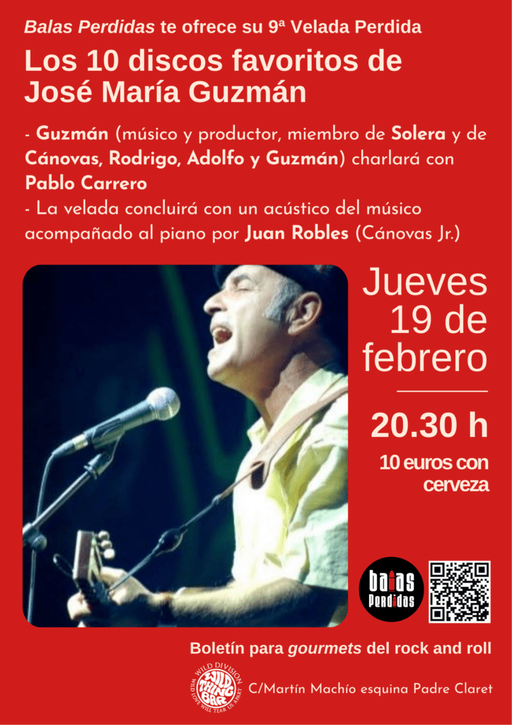 Balas Perdidas, nuestro boletín para gourmets del rock and roll, presenta este jueves 19 de febrero una nueva Velada Perdida en la que su director, Pablo Carrero, conversará con José María Guzmán acerca de sus discos favoritos.