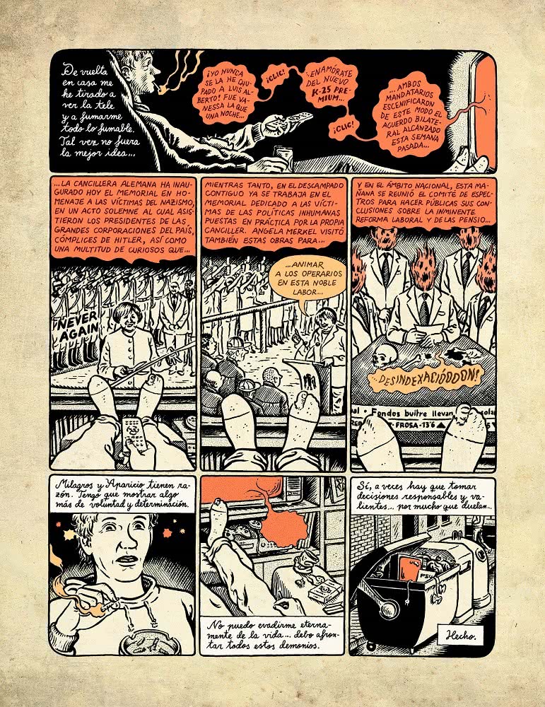 Esa era mi idea. Lo que le pasa a Víctor no es algo que le pase a la gente de su edad en España, sino que es incluso representativo a escala mundial. Por eso no he cerrado nada -al margen de un dibujo en el que se distingue a Rajoy- y todo queda bastante abierto porque me da la sensación de que las historias que funcionan en clave genérica al final pueden hablarle a más gente.