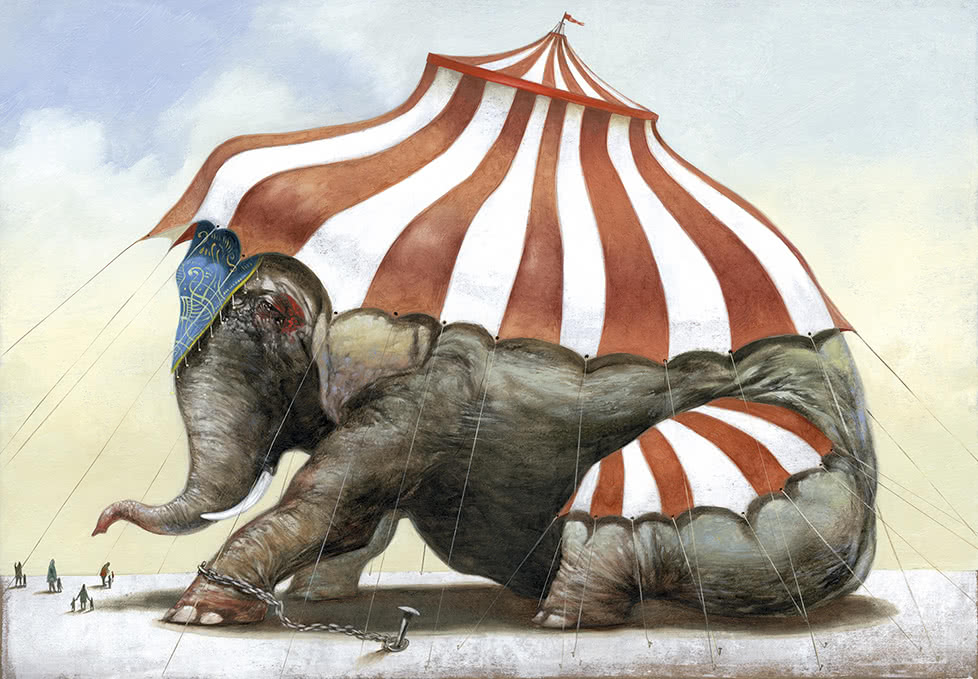 Cuando vio el documental Earthlings, narrado por el actor Joaquin Phoenix, de pronto algo cambió en él. La crueldad que ponía de manifiesto, el especismo, era de tal envergadura que sin terminar de verlo decidió contribuir al cambio y hacerse vegano. Ahora, tiempo más tarde ha encontrado la ocasión ideal para plasmar todos esos sentimientos en un libro editado por Logos y Faada.org. Sin palabras muestra así el verdadero poder de la ilustración: su poesía, su magia, su capacidad para sacudir y remover. No hace falta texto o si acaso, apenas una frase irónica: “¡Cómete el bistec que te hace bien!”, “¡Termínate la leche que crecerás sano y fuerte!” o “¡Vamos que te llevo a ver los elefantes del circo!”.