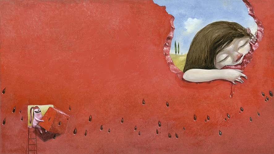 A Olmos le gusta trabajar el óleo. Ha probado con otras técnicas para otros libros: acuarela, tintas, guache, mezcla de guache y óleo, pero ahora reconoce que se queda con el último. “Los acrílicos, por ejemplo, no los soporto porque me da la sensación de que estoy trabajando con plastilina líquida. No me gusta la textura que tienen. En cambio, con el óleo puedo modificar, hacer veladuras, disimular las marcas del pincel y lo más importante, no se arruga el papel”, relata.