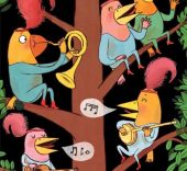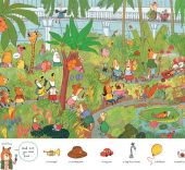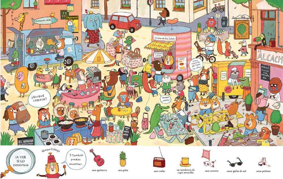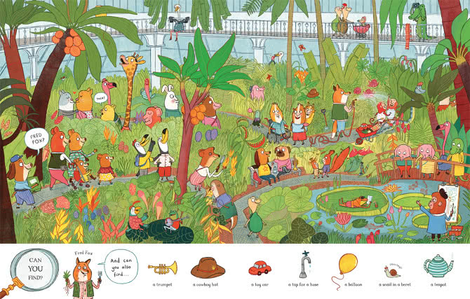 Había disfrutado mucho poniendo gran número de detalles en mis dos libros ilustrados anteriores, Showtime por Billie y Coco y The Toucan Brothers, pero me preocupaba que el lector, como ambas son historias que se desarrollan rápidamente, los pasara por alto. Por eso hacer un ‘libro de búsqueda y hallazgo’ con una historia mínima parecía una buena manera de permitir que el lector se parase a estudiar minuciosamente cada pliego sin perder el hilo de lo que estaba sucediendo en la narración.