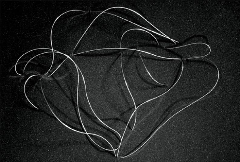 Como la propia Muñoz explica: “En esta exposición se exhibe, por una parte, Tabú, 2012 (30 x 65 x 42 cm) –la primera escultura que realicé en color utilizando una gran variedad de chapas perforadas de acero inoxidable–, y por otra, una serie de objetos escultóricos, fechados en 2013 y 2014 (28 x 23 x 8 cm). Estos objetos se anclan en la pared y están realizados en foam negro con varillas de acero inoxidable y en ellos despliego una sucesión de formas que son como los dibujos espaciales de mis esculturas”.