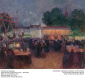 Desde finales del siglo XIX, el nocturno se centró en los nuevos medios de iluminación, el gas y la electricidad. En la fiesta bretona de Puigaudeau, con farolillos y fuegos artificiales, la noche estalla en colores fantásticos. Pero la noche moderna es urbana. Georgia O’Keeffe nos revela una Nueva York insólita. La luna, la farola con halo y el disco rojo del semáforo forman, con el rascacielos y la aguja de la iglesia, una composición casi abstracta, pero de profundo simbolismo romántico. La noche es el tiempo de la imaginación y de los sueños. El surrealista Delvaux combina absurdamente las luces de la calle (como la farola) y del interior (la lámpara en el espejo) para crear un inquietante escenario de inconfundible carácter onírico.