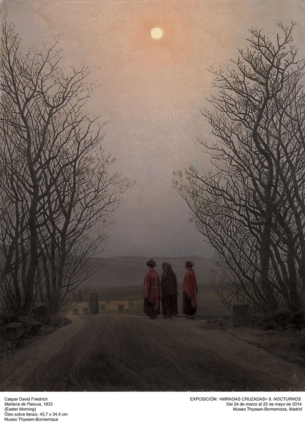De lo pintoresco de Vernet a lo sublime de Friedrich. La luna reina aún en lo alto del cielo, pero en el horizonte despunta ya el alba. Los árboles, aunque todavía desnudos, tienen yemas que anuncian la primavera. Y de este modo, las tres mujeres van al cementerio a través de un paisaje que habla de la Resurrección. Como Friedrich, el inglés Grimshaw explotará mucho más tarde el efecto de los árboles esqueléticos a contraluz.