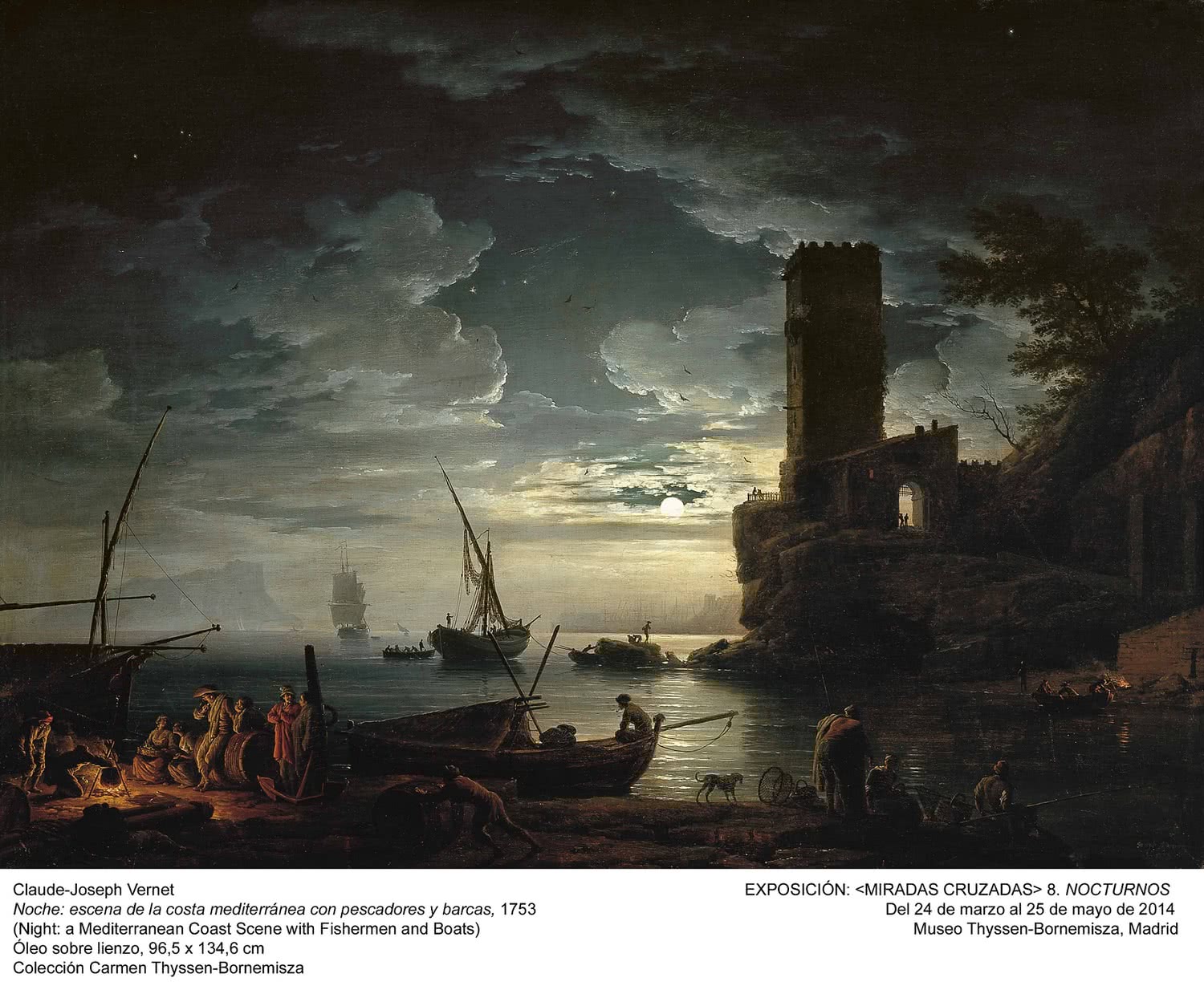 A partir de esos orígenes tonales, casi monocromos, los pintores irán descubriendo que la noche tiene sus propios colores, diferentes de los del día, a veces más intensos. En una escena de pescadores napolitanos, Vernet combina el resplandor frío de la luna con los fuegos de la orilla, que representan la vida humana.