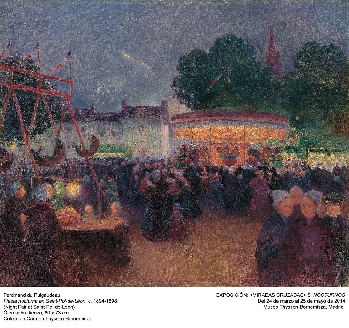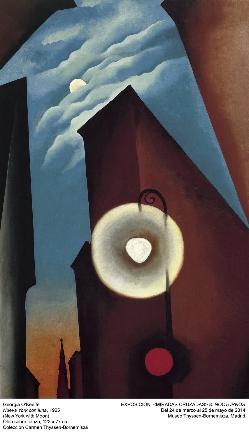 Desde finales del siglo XIX, el nocturno se centró en los nuevos medios de iluminación, el gas y la electricidad. En la fiesta bretona de Puigaudeau, con farolillos y fuegos artificiales, la noche estalla en colores fantásticos. Pero la noche moderna es urbana. Georgia O’Keeffe nos revela una Nueva York insólita. La luna, la farola con halo y el disco rojo del semáforo forman, con el rascacielos y la aguja de la iglesia, una composición casi abstracta, pero de profundo simbolismo romántico. La noche es el tiempo de la imaginación y de los sueños. El surrealista Delvaux combina absurdamente las luces de la calle (como la farola) y del interior (la lámpara en el espejo) para crear un inquietante escenario de inconfundible carácter onírico.