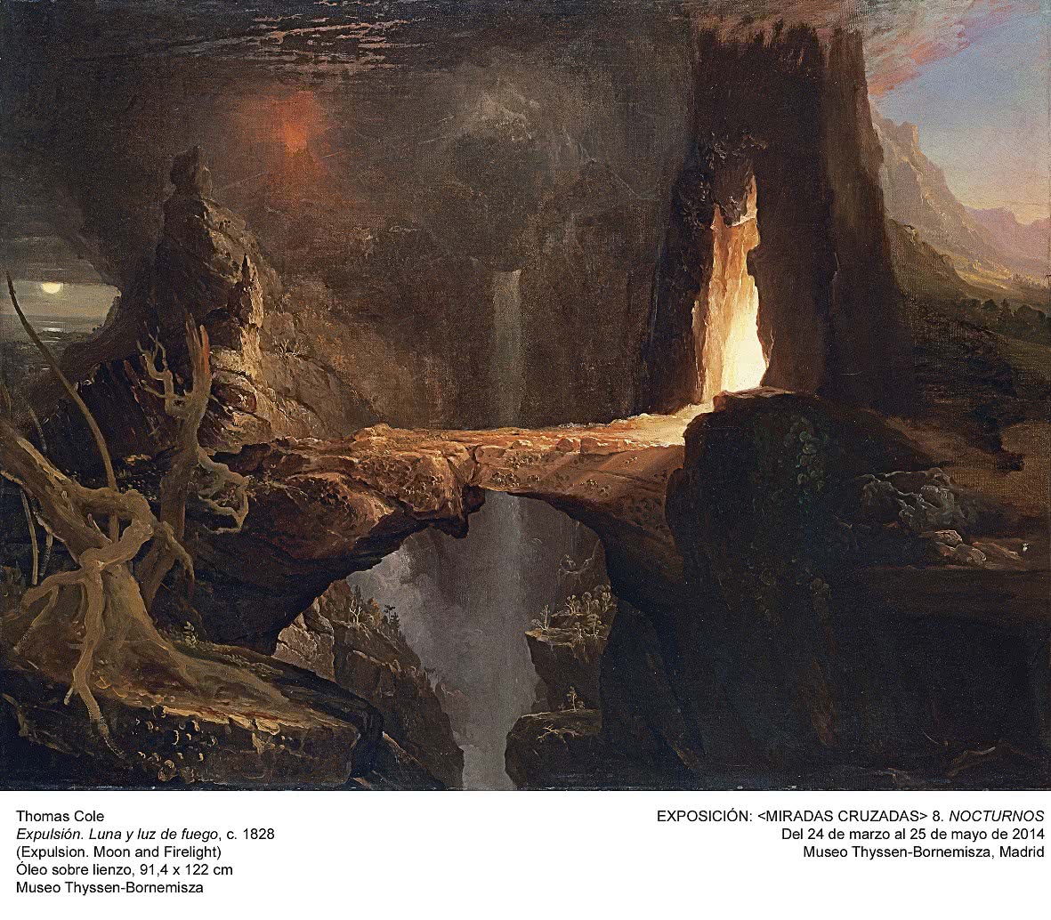 Otro maestro del paisaje simbólico romántico es el americano Thomas Cole. Su Expulsión. Luna y luz de fuego alude a la salida del Edén, aunque en el cuadro no aparezcan Adán y Eva. El puente y la cascada (formando una cruz), el volcán y la luna (otra vez el contraste de luces cálidas y frías) encarnan los extremos del destino humano.