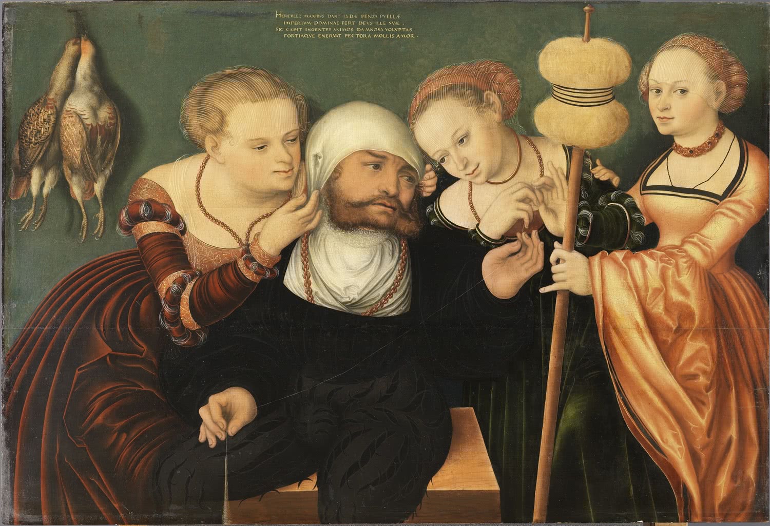 Hércules en la corte de Onfalia narra un episodio mitológico ocurrido en Lidia, donde el héroe había llegado para redimir su culpa tras asesinar a su amigo Ifito. La reina Onfalia le convierte en su esclavo y amante y le obliga a vestir con ropas de mujer y a realizar tareas femeninas, mientras que ella, que no está representada en la escena, luce las ropas y los atributos del héroe.