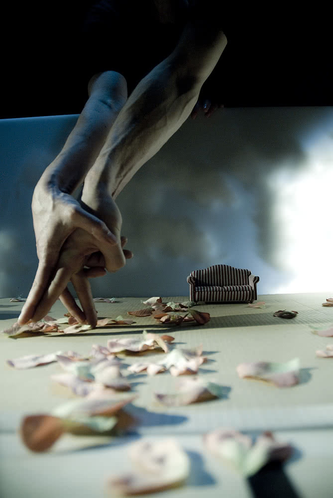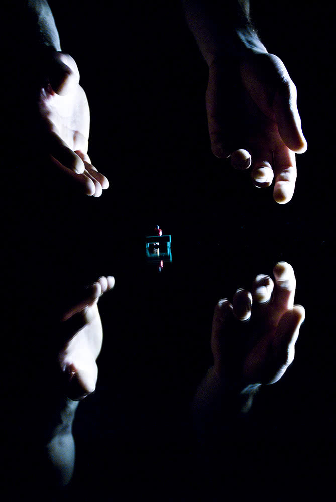 Kiss & Cry muestra una coreografía realizada mediante movimientos de manos y dedos, la proyección de una película y la exposición en vivo del proceso de creación de dicho filme… todo al mismo tiempo. Sobre el escenario conviven armónicamente diferentes códigos y disciplinas: realidad, presencia escénica y un registro sensorial altamente evocador. He aquí una puesta en escena atípica donde las manos y los dedos danzantes se juntan, se acarician y se deslizan entre casas de muñecas y figuras en miniatura, en un juego hipnótico de nanodanza (como así lo define la propia compañía), que descubre a la audiencia un trabajo fuera de lo común y de una precisión absoluta.