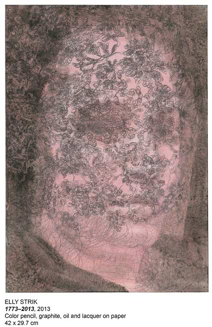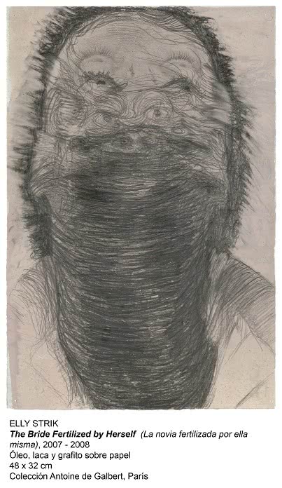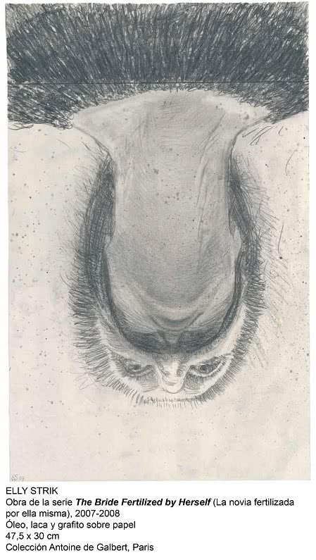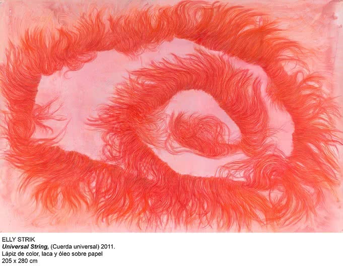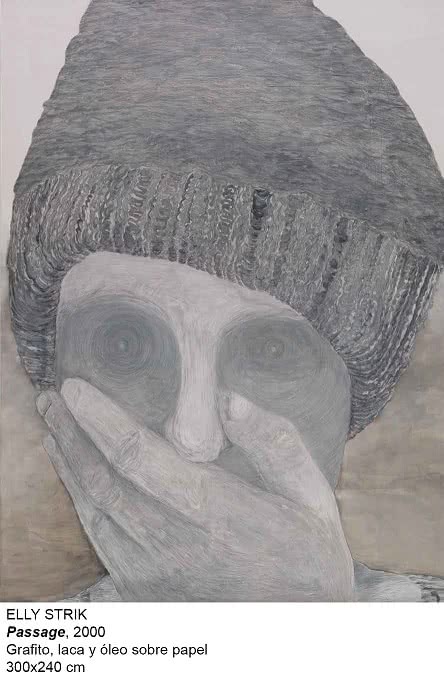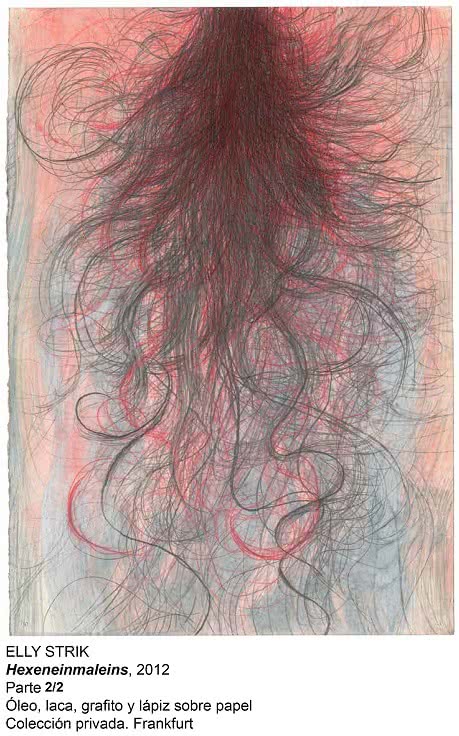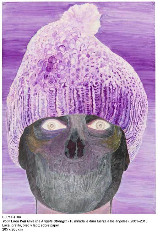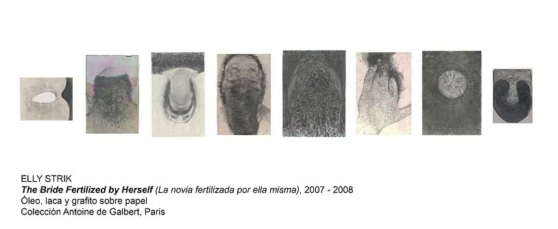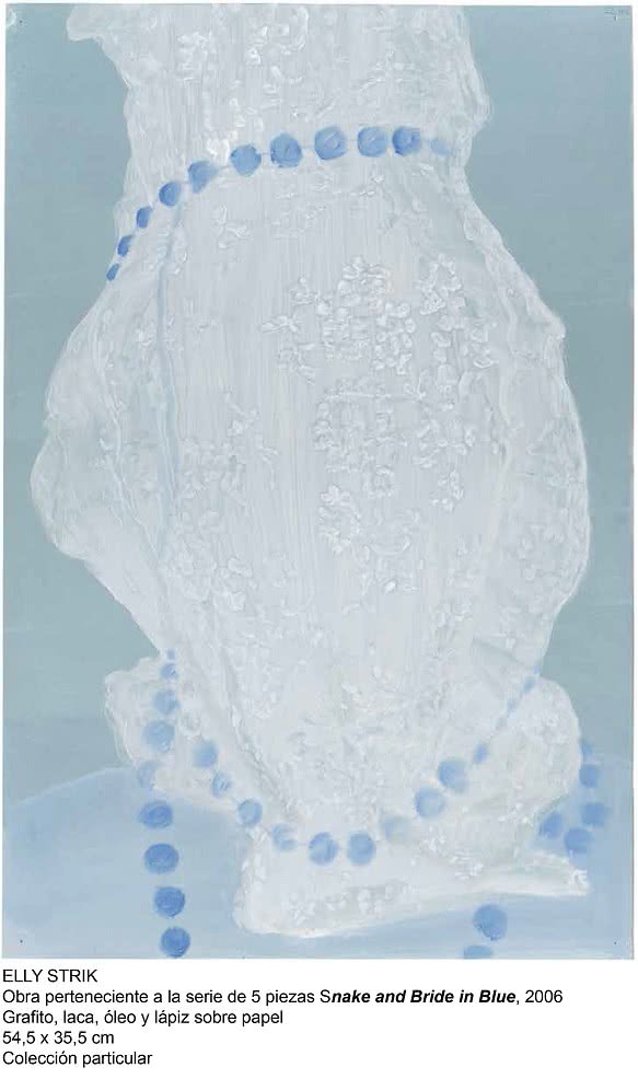 La obra de Elly Strik, dibujo y pintura sobre papel, tiene como tema a novias, nacimiento, ritual y renacimiento, brujas y místicos, cielo y sueños. Las imágenes desvelan y ocultan, informan y desinforman. En sus palabras, busca «apelar a la búsqueda interior y a las inquietudes de cada uno de los espectadores para que así sus ojos sean parte de mi trabajo».