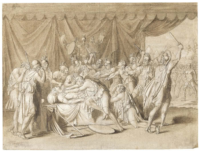 José de Madrazo, ‘La muerte de Viriato, jefe de los lusitanos’, Museo del Prado. [D.6774]. Lápiz, albayalde y tinta parda a la aguada y a la pluma sobre papel verjurado, 422 x 565 mm. © Madrid, Museo Nacional del Prado.