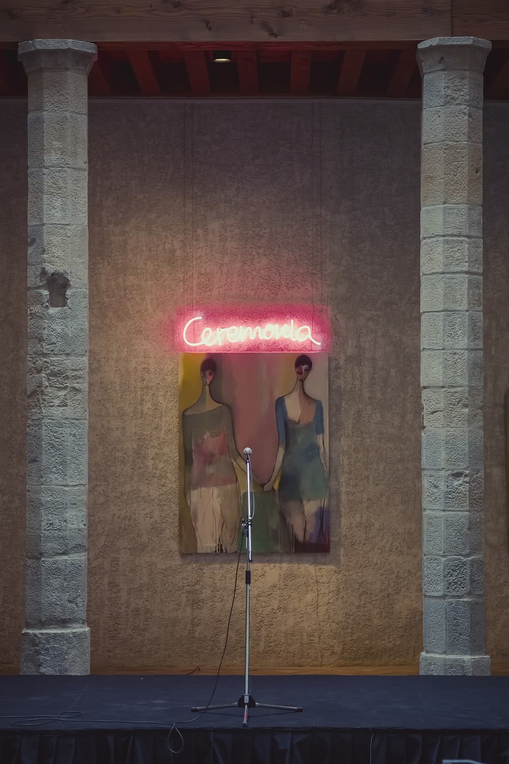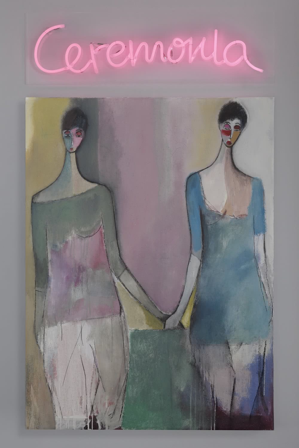 Ceremonia representa a la mujer tanto visual como musicalmente. Se compone de un retablo de 5 x 4 m con 12 obras dedicadas al mundo femenino, fundamentalmente figurativas, y dos carteles de neón en los que aparecen las palabras ‘oración’ y ‘ceremonia’. El proyecto, que se inició en Pamplona el pasado mes de mayo, llega a Madrid donde se podrá ver por primera vez en su totalidad el gran retablo que la compone.