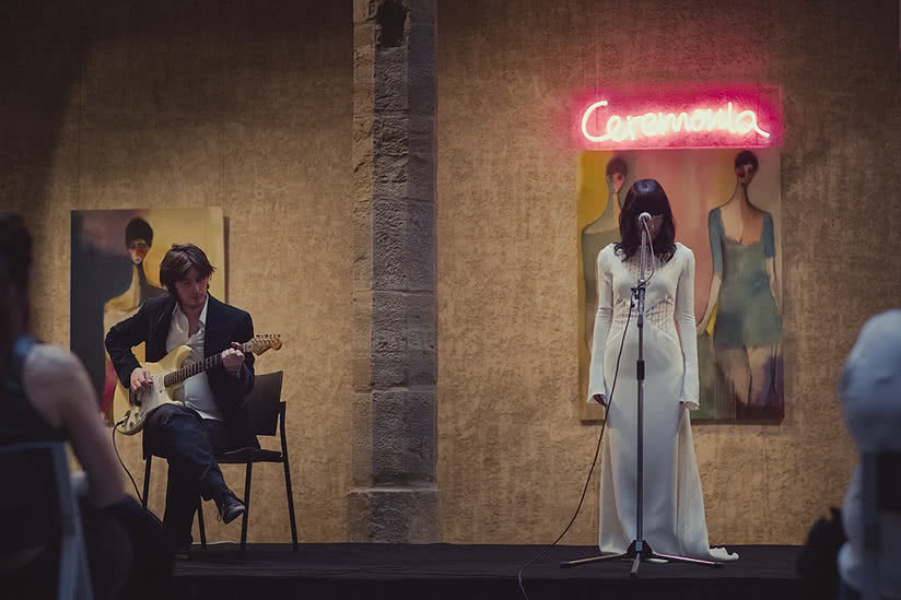 El peso interpretativo y vocal recae en la artista polifacética Cristina Martínez Lana. La cantante, que aparecerá vestida por la diseñadora Carolina Otaduy, se sitúa en el centro de Ceremonia representando a la mujer tanto visual como musicalmente. En directo interpreta la banda sonora de la performance, que ha compuesto el músico Jon Ulecia (Pamplona, 1976).