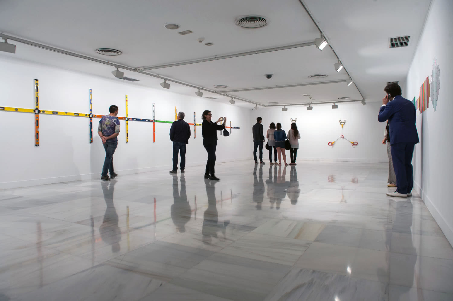 De este modo, una de las obras más destacadas de la exposición está compuesta por 120 cuerdas náuticas de distintos colores, perfectamente alineadas y pegadas a la pared de una de las salas. Como en otras obras de la muestra, 120 Cords navega entre el dibujo y la escultura.