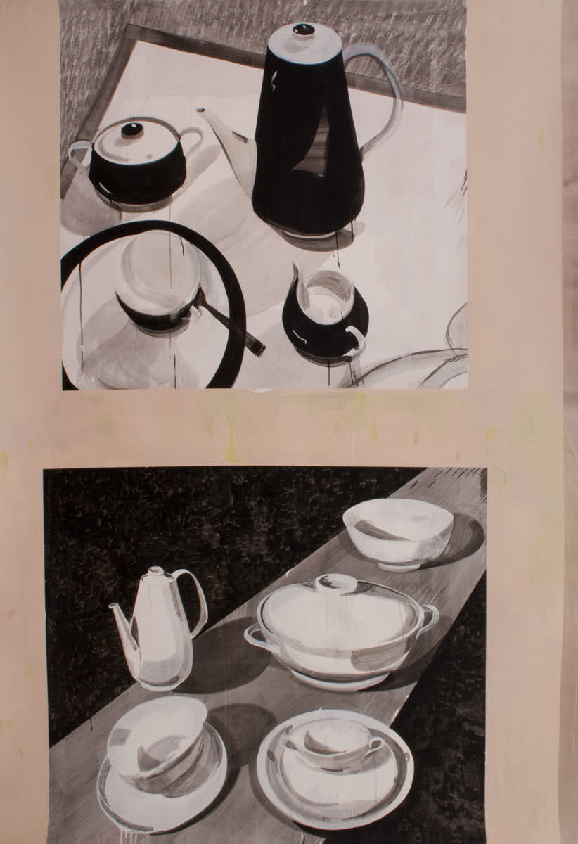 Charles Eames (1907-1978) y Ray Eames (1912-1988), casados en 1941, fueron dos diseñadores-arquitectos-artistas que convirtieron su hogar en un centro generador de ideas y productos. Para los Eames, el proceso del diseño solo tendría éxito mediante la conexión entre las demandas de la sociedad, las necesidades de los clientes y los intereses del diseñador, que derivarían en el desarrollo de productos que fueran útiles a los tres. Miki Leal presenta un políptico formado por 10 obras de pequeño formato que mezclan su biografía con sus trabajo como diseñadores, en el fondo, la única forma de entender su carrera. Se inicia con una imagen de la boda de la pareja, para continuar con algunas de sus obras más famosas (silla de madera curvada, chaise long de Billy Wilder, vídeos para IBM…). La serie finaliza con una imagen de la casa-taller de los Eames en Santa Mónica.