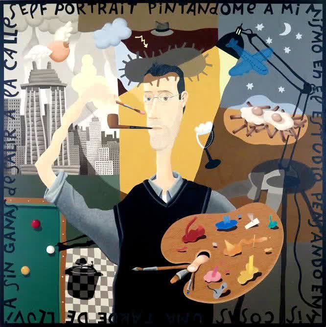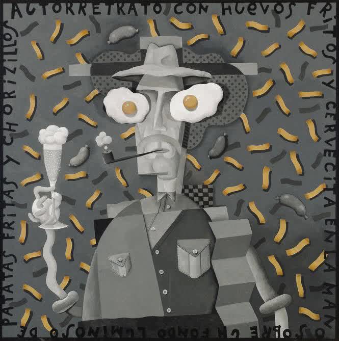 Fernando Bellver. Autorretrato con huevos fritos y cervecita en la mano o sobre un fondo luminoso de patatas fritas y chorizillos.