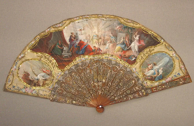 La pintura de los abanicos de estilo Luis XV, identificados con el rococó, refleja la creciente hegemonía de la mujer en la vida social y ella será la protagonista indiscutible reflejada en la diosa Venus, personificación del amor, la belleza y la fertilidad; en Juno, diosa del matrimonio y protectora de la mujer; o de Onfalia, que hizo que Hércules olvidara su valentía abandonándose a los placeres del amor.