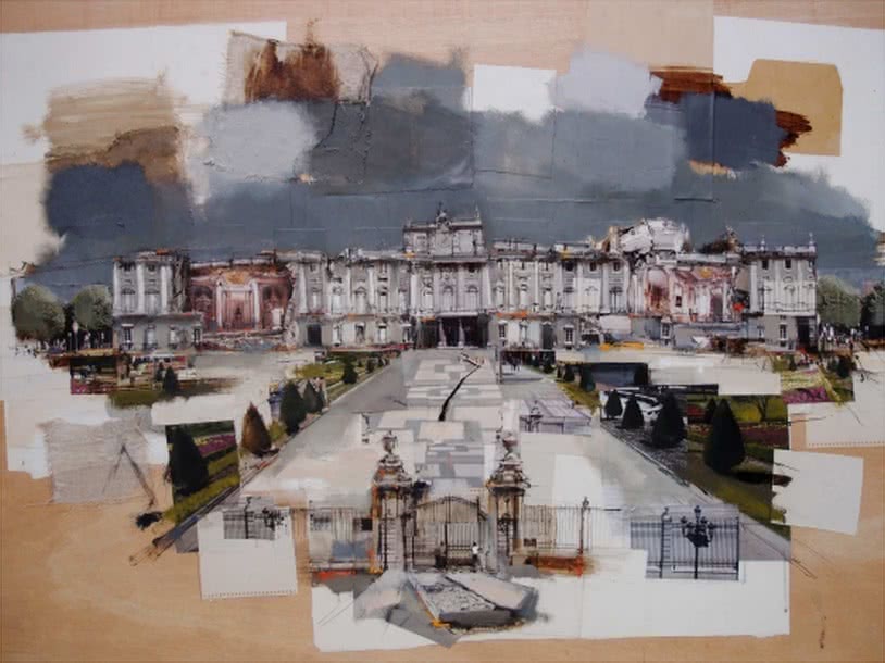 Ahora se adentra en las calles y edificios de Madrid, con obras brillantes, espontáneas, frescas, por las que desfilan la ironía y el buen oficio. La Gran Vía, el Palacio Real o el Museo Reina Sofía van más allá del action-painting porque recuperan la esencia de la pintura, no le vale solo el acto de pintar.