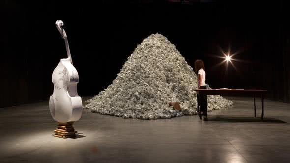 En su instalación, que nace de la práctica del dibujo detallista, la creadora reivindica, por un lado, el silencio en una sociedad invadida por el ruido. Por otro, esa tentativa, silenciada, individual, se resuelve expandida, rotunda, colectiva. La experiencia es física, pero sobre todo psíquica, mental. El gran espacio se transforma en una habitación dominada por una mesa donde la brasileña escenifica un sentimiento, el de la dificultad de la creación, de componer, de manifestarse.