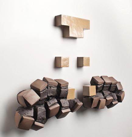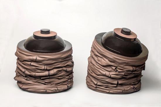 El trabajo de Gregorio Peño parte de una concepción formal geométrica que contrasta con la aparición de lo orgánico en forma de abatimiento o expansión de la arcilla fundida.