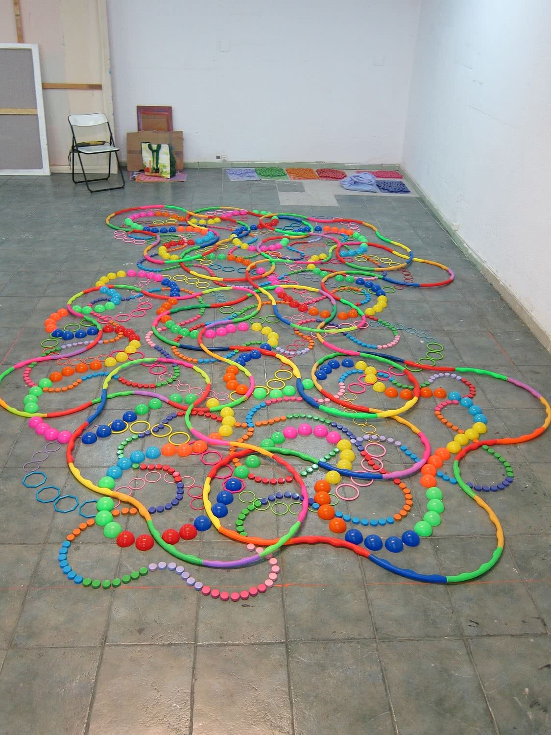 Hula Ground se puede considerar como un poema objetual que remite al visitante a esos parques de recreo en los que la energía, la ingenuidad y la curiosidad de los niños se canalizan a través de algo tan trascendente como es el juego. Esta área de entretenimiento e inocencia vinculada a la simbología de lo infantil es un conjunto de contornos multicolores dispuesto a modo de superficie de recreo que introduce al espectador en un escenario para la contemplación y la diversión.