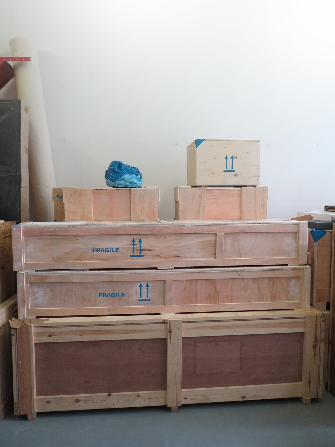 Además de lienzos con voluntad de esculturas, Ángela de la Cruz presenta un conjunto de obras que titula Throw. Son, contraponiéndolas a los otros trabajos que presenta en la muestra, esculturas con voluntad de pinturas. En definitiva, esqueomorfos monocromos en aluminio de lo que sería una caja de cartón doblada. En esta serie existe el juego del trompe l’oeil (trampantojo), y lo que en apariencia es blando, realmente es duro. En su juego de inversos, la artista cuelga en la pared, esta vez sí, lo que en realidad estamos habituados a ver en el suelo, que son las cajas de cartón.