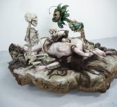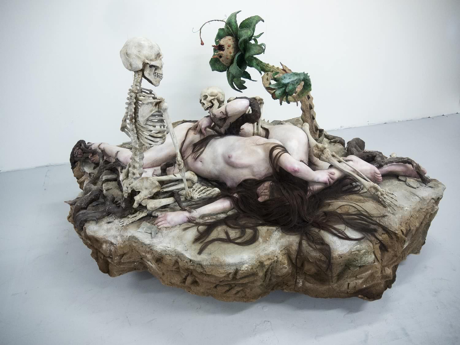 Las esculturas se agrupan en el tercer eje. Son seis y están dispuestas en diferentes salas; tres de ellas inspiradas en Étant donnés de Duchamp y en buena parte de la iconografía de naturaleza del museo. Entre las restantes están una versión del Zeus/Poseidón del Museo de Atenas, que el artista convierte en una alegoría de la decadencia de la Europa actual; Creciendo en cuatro estados, que representa el crecimiento del propio artista, y El Heliogábalo en diálogo con el cuadro de los disciplinantes de Goya.