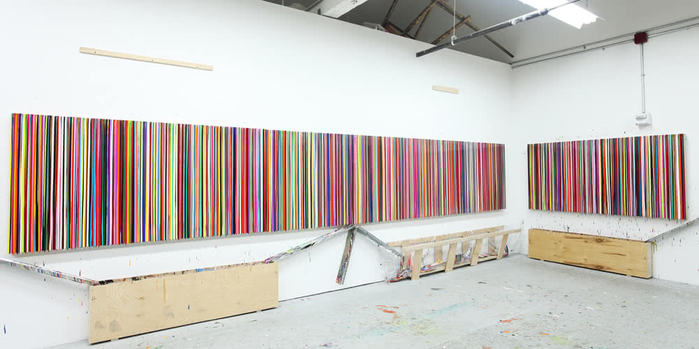 En sus obras de gran formato, los pigmentos disueltos en resina epoxi corren lentamente hacia abajo, provocando brillantes rayas verticales; por el contrario hay otras piezas en las que pequeños cráteres perforados revelan, casi de forma arqueológica, las distintas capas de pintura; pero si el visitante se encuentra delante de sus site-spefifics, su percepción de alterará, ya que el artista cubre paredes, suelo y techo, sometiendo toda la arquitectura con sus rayas de colores iridiscentes.