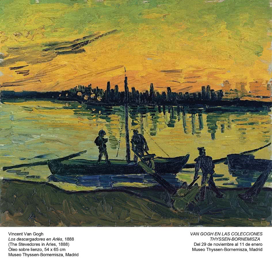 La creación de Van Gogh experimentó un giro decisivo en 1886, a consecuencia de su encuentro en París con los impresionistas. Y sin embargo, también existe continuidad entre la pintura de su etapa holandesa y su obra posterior en Francia. El artista se inspiró en el impresionismo para pintar varios cuadros de barcos descargando, primero desde un punto de vista elevado y con colores claros y más tarde, en Los descargadores en Arlés, con un punto de vista bajo y tonos sombríos. El fuerte contraste entre las siluetas oscuras de las figuras y la barca contra la ardiente luz del atardecer produce un intenso efecto dramático.